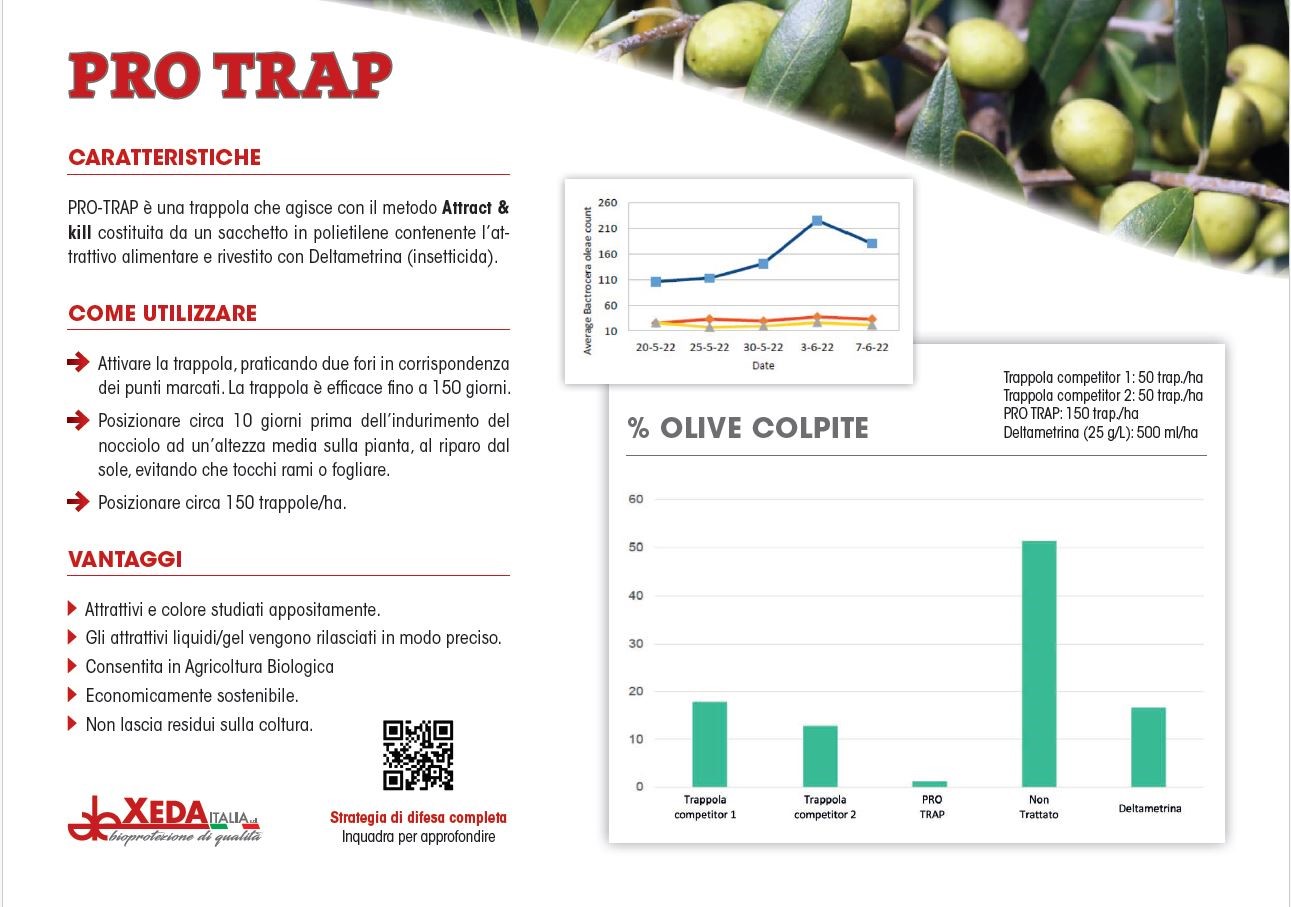 Con PROTRAP® andiamo a completare la strategia di difesa per l’olivo fatta da una numerosa serie di prodotti in grado di coprire tutte i principali problemi creati da insetti e funghi oltre che a incrementare la produzione e la resa in olio.